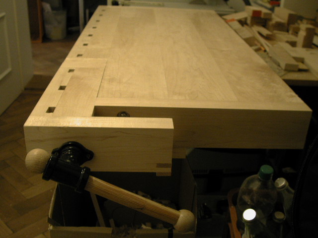Die Hinterzange wird jetzt montiert und die Spindel eingedreht und an der rechten Aussenseite der Zange verschraubt. Noch einmal Testen, ob alles schön leichtgängig und spielfrei läuft, und dann zuletzt den Deckel zum Schliessen der Bankhakenlöcher aufleimen. Die fertige Bank sollte jetzt ungefähr so aussehen: