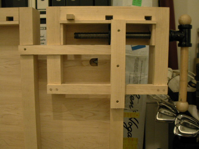 Es wird immer einfacher: Die Führung der Hinterzange ist eine gerade Leiste mit den Abmessungen 3 x 3 cm, die von der Gratleiste zur rechten Endleiste geht und auf der der Schiebebacken der Hinterzange läuft. Zur Montage wird diese Leiste in der entsprechenden Nut der Endleiste verklemmt und dann durch Hin- und Herschieben der Hinterzange die Position auf der Gratleiste gefunden, an der die Zange spielfrei und exakt läuft. Diese Position wird angezeichnet und mit der Handsäge und dem Stemmeisen eine Nut in der richtigen Tiefe hergestellt
